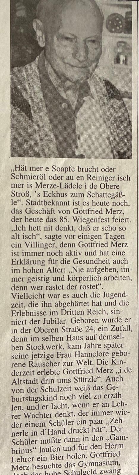 „Ich hett nit denkt, dass der scho so alt isch“, sagte vor einigen Tagen ein Villinger, denn Gottfried Merz, für viele Villinger de Seife-Merz, ist (in 2000) noch immer noch aktiv und erklärte seine Gesundheit auch im hohen Alter: „Nie aufgeben, immer geistig und körperlich arbeiten, denn wer rastet, der rostet.“