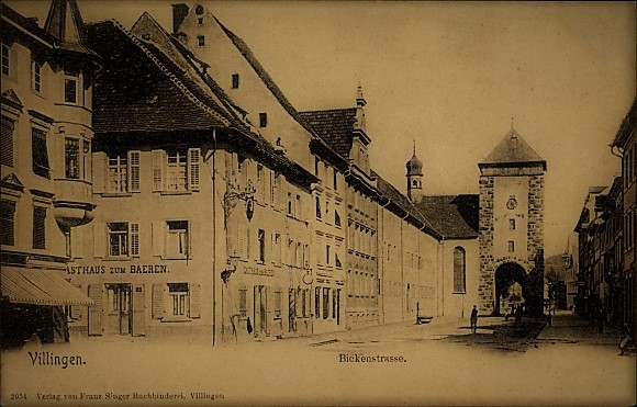 „In der Tat ist die Beschriftung des Gebäudes ganz links im Bild mit „Gasthaus zum Ackerbau“ interessant. Ich habe im Adressbuch von Villingen aus dem Jahre 1900 nachgesehen. Dort habe ich keinen Hinweis auf ein Gasthaus gefunden, das diesen Namen hatte. Auch speziell in der Bickenstraße habe ich keine Gastwirtschaft gefunden, die so oder ähnlich bezeichnet wurde. Zudem taucht der Begriff „zum Ackerbau“ nicht in unseren verzeichneten Archivbeständen auf. Insofern wäre es tatsächlich interessant zu erfahren, woher die Bezeichnung stammt.