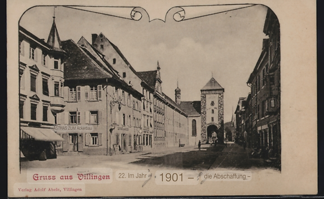 Auch hat der Verlag „Adolf Abele, Villingen“ um 1900 zahlreiche Ansichtskarten produziert – gelegentlich mit individuell bearbeiteten Negativen oder lokalem Scherztext.„