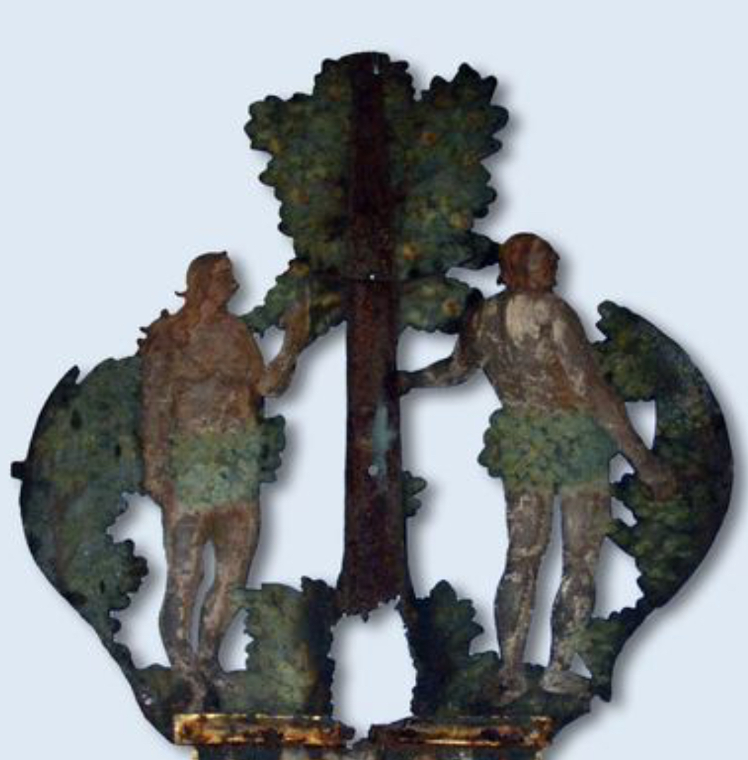So sah es wohl aus, das Stechschild „Zum Paradies“, beidseitig mit Adam und Eva im Paradiesgarten mit Apfelbaum und Schlange. Adam wendet sich ab, Eva zeigt in den Baum mit goldenen Äpfeln.