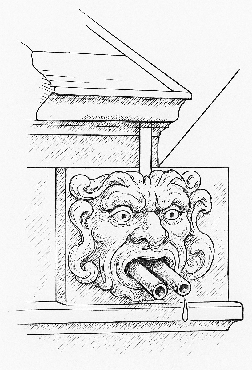 Am unteren Abschluss, also an der Fratze unter der Konsole, tritt das Rohr aus dem Mund- oder eben Maulbereich hervor.