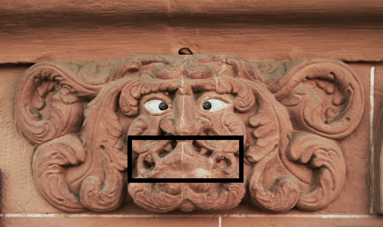 Gesimse, Portale und Erker erhielten Kopfmasken, Grotesken oder Dämonenfratzen.