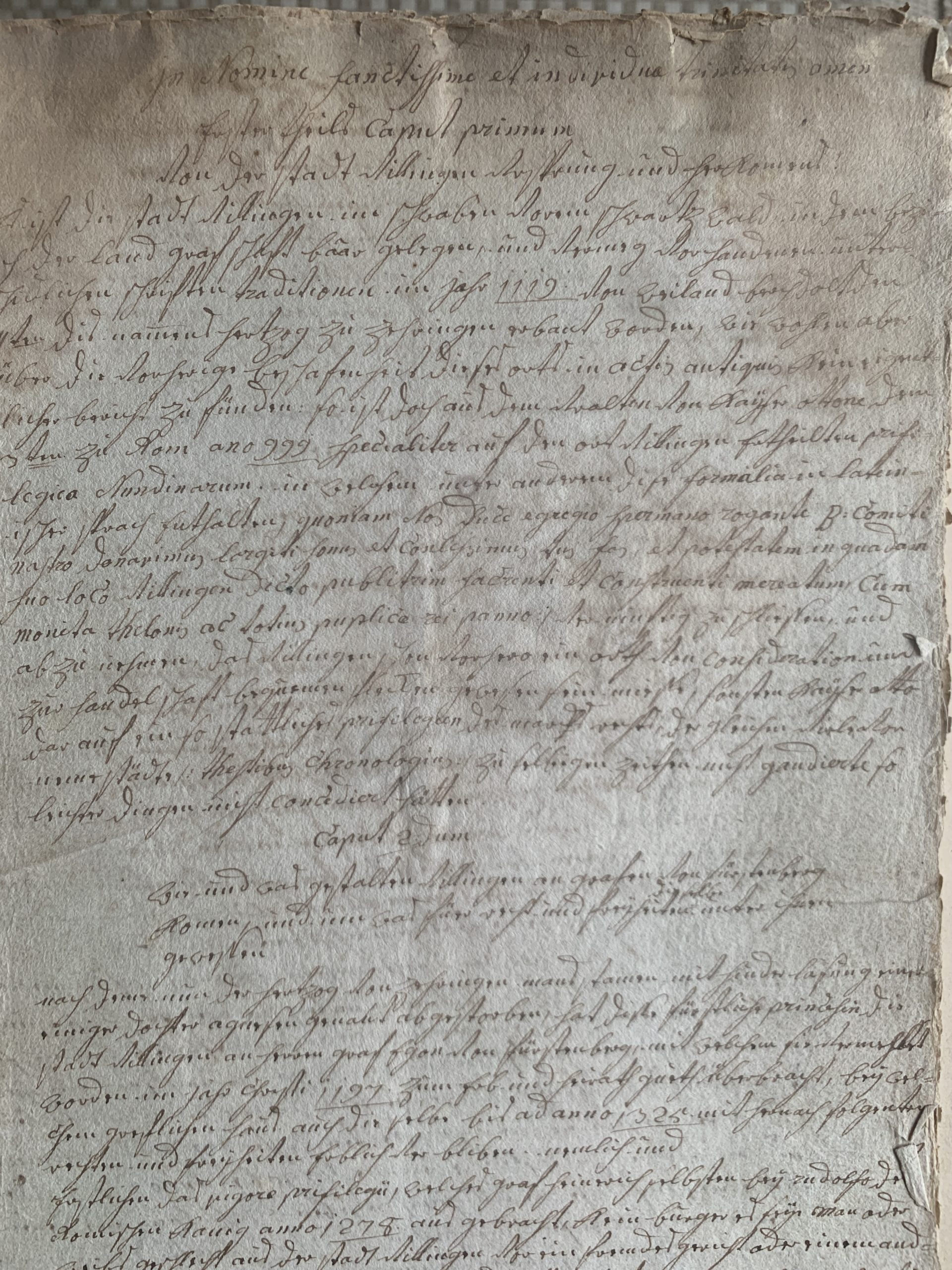 Bei einem weiteren historischen Schriftstück, das auf unklare Weise, zu unbekanntem Zeitpunkt auch zustande und in der Neuzeit in einen nicht mehr erklärlichen privaten Besitz kam, handelt es sich tatsächlich um einen Aufsatz über die Geschichte der Stadt Villingen von ihren Ursprüngen bis zur Übernahme der Herrschaft durch das Haus Fürstenberg.